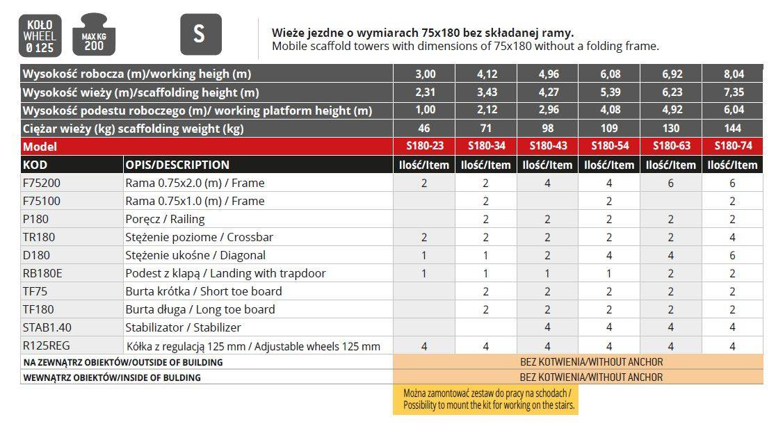 WIEŻA ZBUDOWANA JEST Z RURY ALUMINIOWEJ O ŚREDNICY 50 MM. SKŁADA SIĘ Z RAM (0.75×2.0 M) – WYGODA W MONTAŻU. POSIADAJĄ NOWE ZŁĄCZA ZE STALI NIERDZEWNEJ BEZ SPAWÓW CO ZWIĘKSZA O 50% SZTYWNOŚĆ WIEŻY JEZDNEJ I PODWAJA JEGO ŻYWOTNOŚĆ. PRACUJEMY NA BARDZO BEZPIECZNYM PODEŚCIE ROBOCZYM MOCOWANYM NA HAKI. PODESTY ZABEZPIECZONE SĄ DREWNIANYMI BURTAMI. WIEŻE ŁATWO PRZEMIESZCZAĆ ZA POMOCĄ WYTRZYMAŁYCH KÓŁ DOBREJ JAKOŚCI I NIEBRUDZĄCYCH O ŚREDNICY 125 MM Z POLIAMIDU OBLANE POLIURETANEM. ELEMENTY RUSZTOWANIA SĄ ODPORNE NA KOROZJĘ. MAKSYMALNE OBCIĄŻENIE WYNOSI 180 – 200 KG.