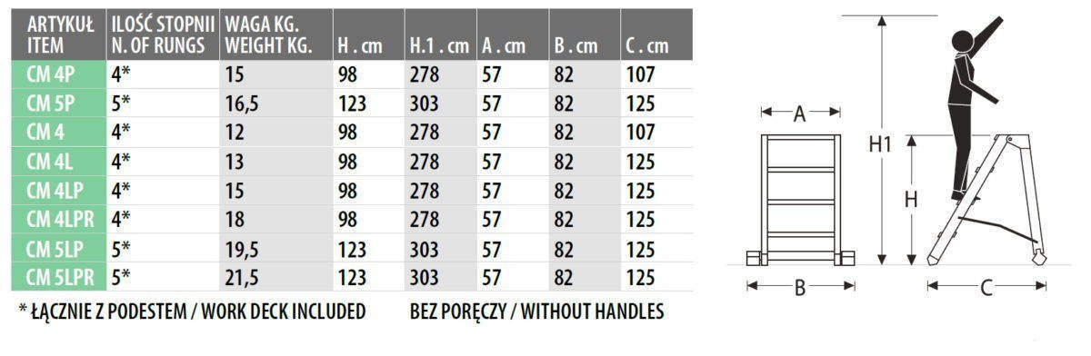 OPIS WARIANTU: MODEL CM5LPR Z PORĘCZĄ, KÓŁKAMI I POSZERZONYM PODESTEM, WYSOKOŚĆ ROBOCZA 3,03M.