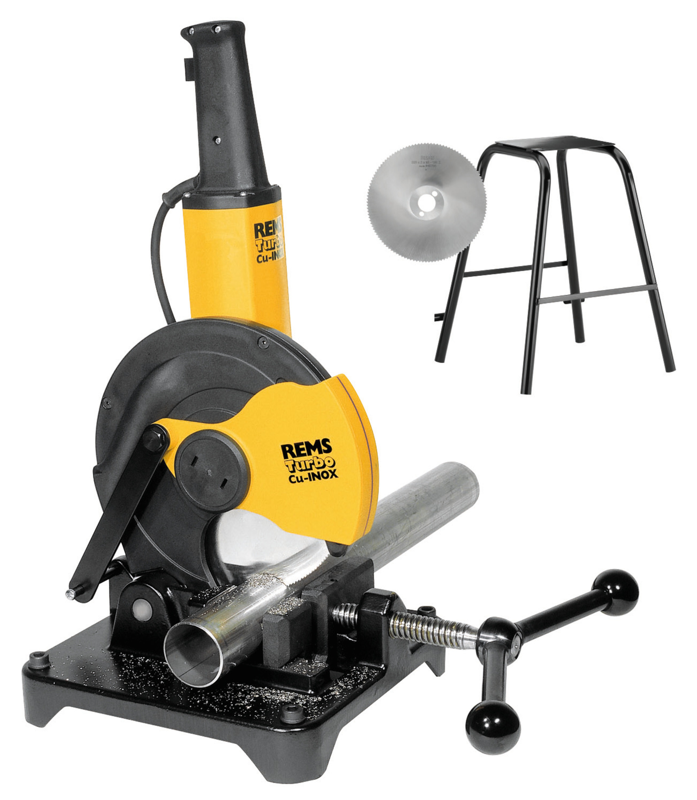 UNIWERSALNA PILARKA TARCZOWA DO RUR RENOMOWANEGO PRODUCENTA URZĄDZEŃ DLA INSTALATRÓW REMS. MODEL TURBO CU-INOX Z IMADŁEM PODWÓJNYM DO BEZGRATOWEGO, PRODSTOPADŁEGO I SZBKIEGO CIĘCIA RUR ZE STALI NIERDZEWNEJ, STALI WĘGLOWEJ, MIEDZIANYCH, IDEALNA DO SYSTEMÓW ZACISKOWYCH I WIELU INNYCH ZASTOSOWAŃ. RÓWNIEŻ DO CIĘCIA CIĘKOŚCIENNYCH PROFILI INSTALACJI NATYNKOWYCH.