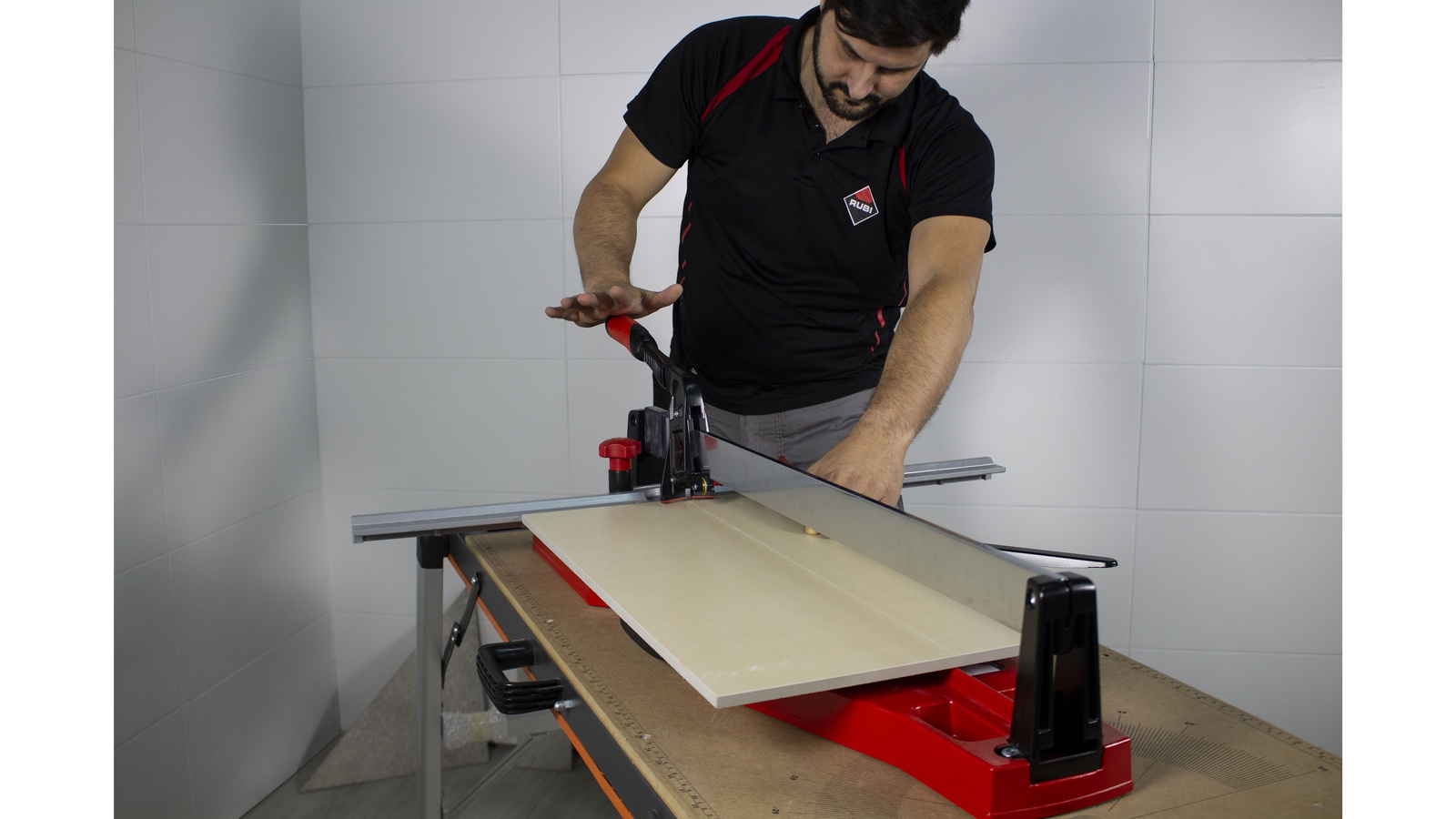 - POSIADAJĄ ALUMINIOWĄ PODSTAWĘ DWUWARSTWOWĄ Z EFEKTEM TŁUMIENIA UDERZEŃ ORAZ PODPORAMI BOCZNYMI POD PŁYTKI DUŻYCH FORMATÓW. WYKONAWCA PODCZAS CIĘCIA STOI ZA PRZECINARKĄ PRZY PRZYMIARZE CZOŁOWYM I CIĄGNIE GŁOWICĘ DO SIEBIE, BY WYKONAĆ NACIĘCIE.