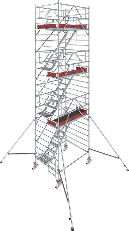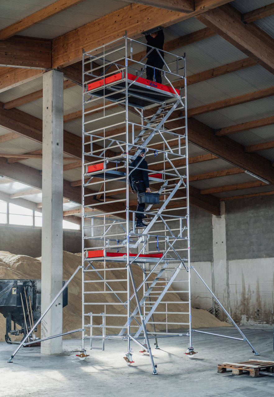 - DZIĘKI WYPOSAŻENIU RUSZTOWANIA W SCHODY MOŻNA ŁATWO PRZENOSIĆ NARZĘDZIA ORAZ CIĘŻKIE ELEMENTY MIĘDZY POZIOMAMI;