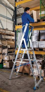 DRABINA Z POWIĘKSZONĄ PLATFORMĄ ROBOCZĄ Z PRZEZNACZENIEM DO PRAC MAGAZYNOWYCH.