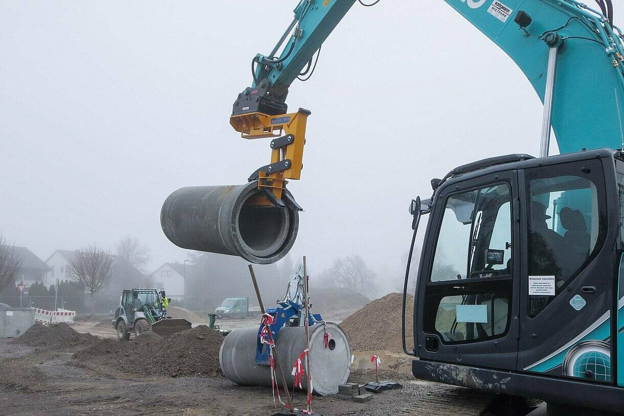 OPERATOR KOPARKI UMIESZCZA BOSY KONIEC RURY, KTÓRA MA BYĆ ZAINSTALOWANA, ZA POMOCĄ TRZPIENIA MONTAŻOWEGO DO RUR, NA KIELICHOWYM KOŃCU RURY JUŻ W WYKOPIE. NASTĘPNIE RURY SĄ ŁĄCZONE Z ODPOWIEDNIĄ SIŁĄ. DO PRAWIDŁOWEJ PRACY OBEJMY WYMAGANY JEST MINIMALNY CIĘŻAR RURY 600 KG.