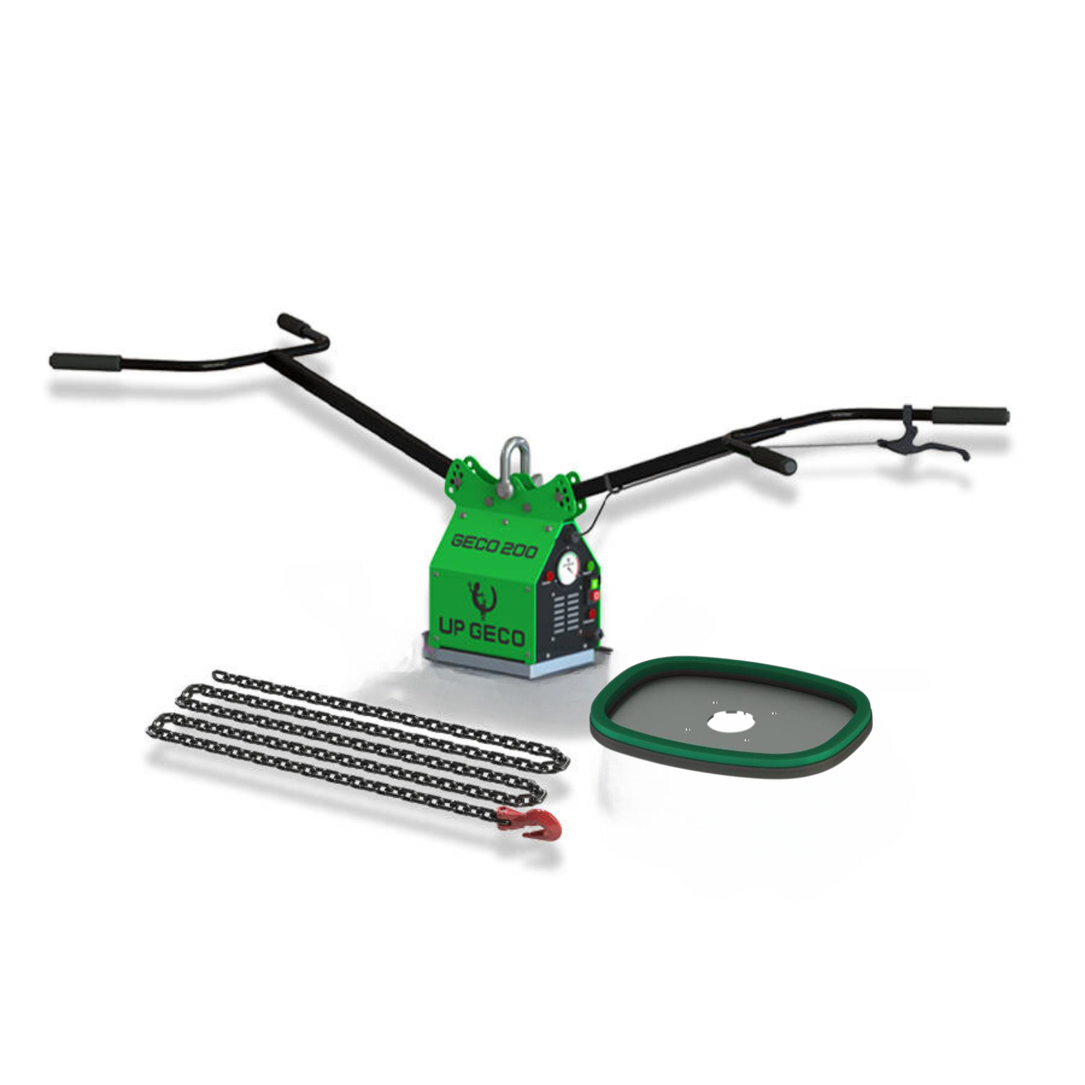 GECO 200 TO CHWYTAK BRUKARSKI DO PRZENOSZENIA, PODNOSZENIA I UKŁADANIA PŁYT CHODNIKOWYCH, PŁYT TARASOWYCH, PŁYT GRANITOWYCH, PŁYT Z GRESU PORCELANOWEGO, KRAWĘŻNIKÓW ORAZ PREFABRYKATÓW O WADZE NIE PRZEKRACZAJĄCEJ 200 KILOGRAMÓW, CHWYTAK PODCIŚNIENIOWY GECO 200 POWSTAŁ Z MYŚLĄ O EFEKTYWNYM I BEZPIECZNYM PRZENOSZENIU PŁYT Z MATERIAŁÓW NAWET O DUŻEJ POROWATOŚCI.