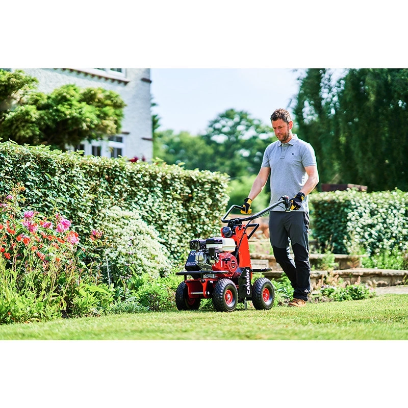 WYCINARKA WYPOSAŻONA JEST W NAPĘD KÓŁ TYLNYCH UŁATWIAJĄCY PORUSZANIE I PRACĘ. MASZYNA W TRAKCIE PRZEJAZDU WYCINA PAS MURAWY O SZEROKOŚCI 30 CM NA GŁĘBOKOŚCI OD 10 MM DO 35 MM. POZIOM ZAGŁĘBIENIA NOŻA ROBOCZEGO REGULUJE SIĘ W ŁATWY SPOSÓB ZA POMOCĄ POKRĘTŁA. NÓŻ JEST WYKONANY Z HARTOWANEJ STALI, OSTRZE MOŻE ZOSTAĆ ODWRÓCONE, CO GWARANTUJE JEGO PODWÓJNĄ TRWAŁOŚĆ.
