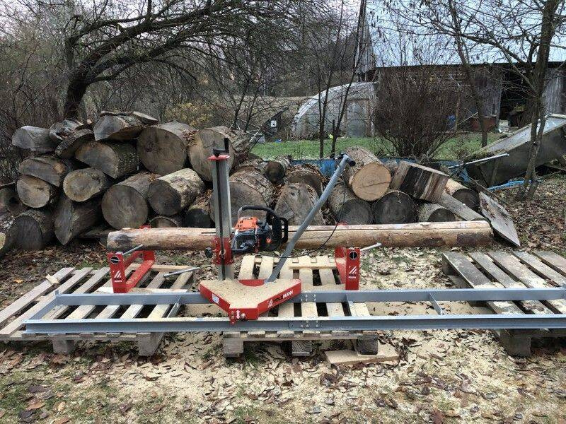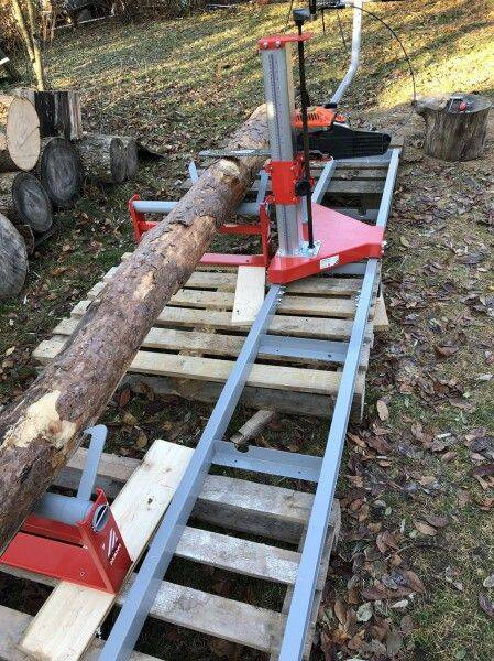 PRZYSTAWKA DO PIŁY ŁAŃCUCHOWEJ, MINI MOBILNY TRAK HOLZMANN MOBAS2 W POŁĄCZENIU Z PIŁĄ ŁAŃCUCHOWĄ UMOŻLIWIĄ OBRÓBKĘ KŁÓD NA DESKI.