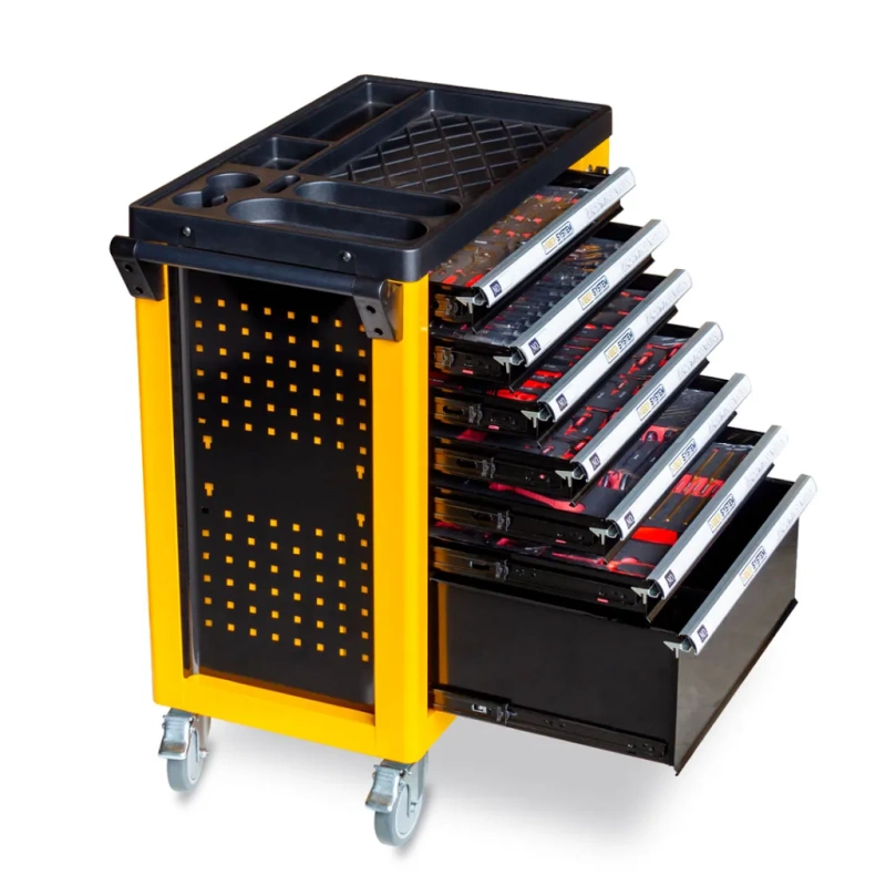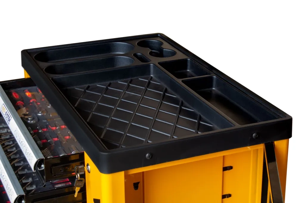 SZAFKA NARZĘDZIOWA MOBILNA MARKI VIBER-SYSTEM TO IDEALNE ROZWIĄZANIE DO ZACHOWANIA ŁADU NA STANOWISKU PRACY ABY MIEĆ KAŻDE POTRZEBNE NARZĘDZIE POD RĘKA. WÓZEK ZOSTAŁ WYPOSAŻONY W ERGONOMICZNE UCHWYTY WBUDOWANE W BLAT ORAZ SZUFLADY Z PEŁNYM WYSUWEM, KTÓRE PORUSZAJĄ SIĘ NA ŁOŻYSKACH KULKOWYCH. CENTRALNY ZAMEK ZAMYKAJĄCY WSZYSTKIE SZUFLADY, Z PODWÓJNYMI ŚCIANKAMI ORAZ BLOKADĄ, ZAPEWNIA DODATKOWĄ OCHRONĘ. CZTERY KÓŁKA UMOŻLIWIAJĄ ŁATWY TRANSPORT. BLAT Z UNIWERSALNĄ PERFORACJĄ, WYKONANY Z POLIPROPYLENU, JEST ODPORNY NA OLEJE I SMARY. W ZESTAWIE ZNAJDUJE SIĘ RÓWNIEŻ PUSTA SZUFLADA.