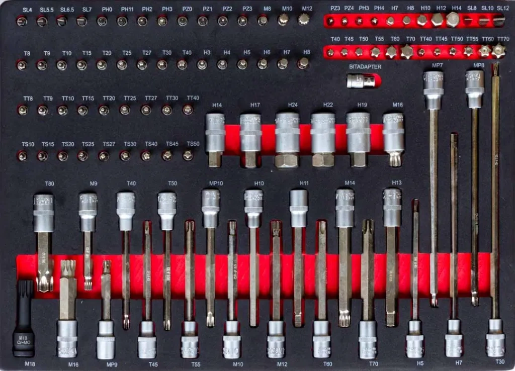 - 28 SZT. BITÓW DO GNIAZD 1/2": SZEŚCIOKĄTNE: H5, 7, 10, 11, 13, 14, 17, 19, 22, 24,IMBUSOWE: M9, 10, 12, 14, 16, 16H, KWADRATOWE: R6, 8, 9, 10, TORX: T30, 40, 45, 50, 55, 60, 70, 80