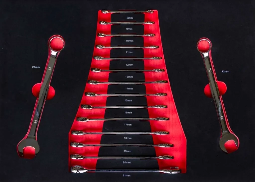 - 16 SZT. KLUCZY PŁASKO-OCZKOWYCH: 8, 9, 10, 11, 12, 13, 14, 15, 16, 18, 19, 20, 21, 22, 24 MM