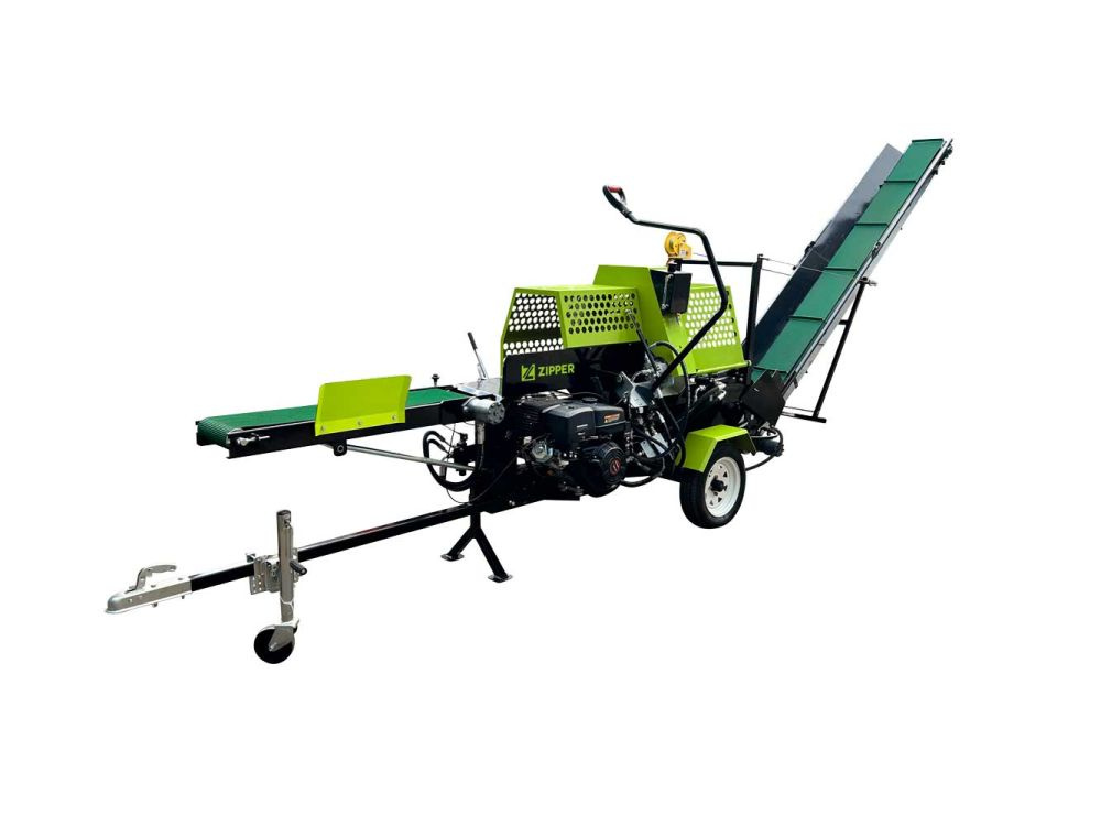 ZIPPER ZI-SPA380 Z HYDRAULICZNYM PRZENOŚNIKIEM PODAJĄCYM KŁODY, PIŁĄ (AKTYWOWANĄ RĘCZNIE), RĘCZNIE REGULOWANYM KLINEM ROZŁUPUJĄCYM, SIŁĄ ROZŁUPYWANIA 20T I OBROTOWYM PRZENOŚNIKIEM ODBIORCZYM DLA GOTOWYCH KŁÓD DREWNA OPAŁOWEGO.