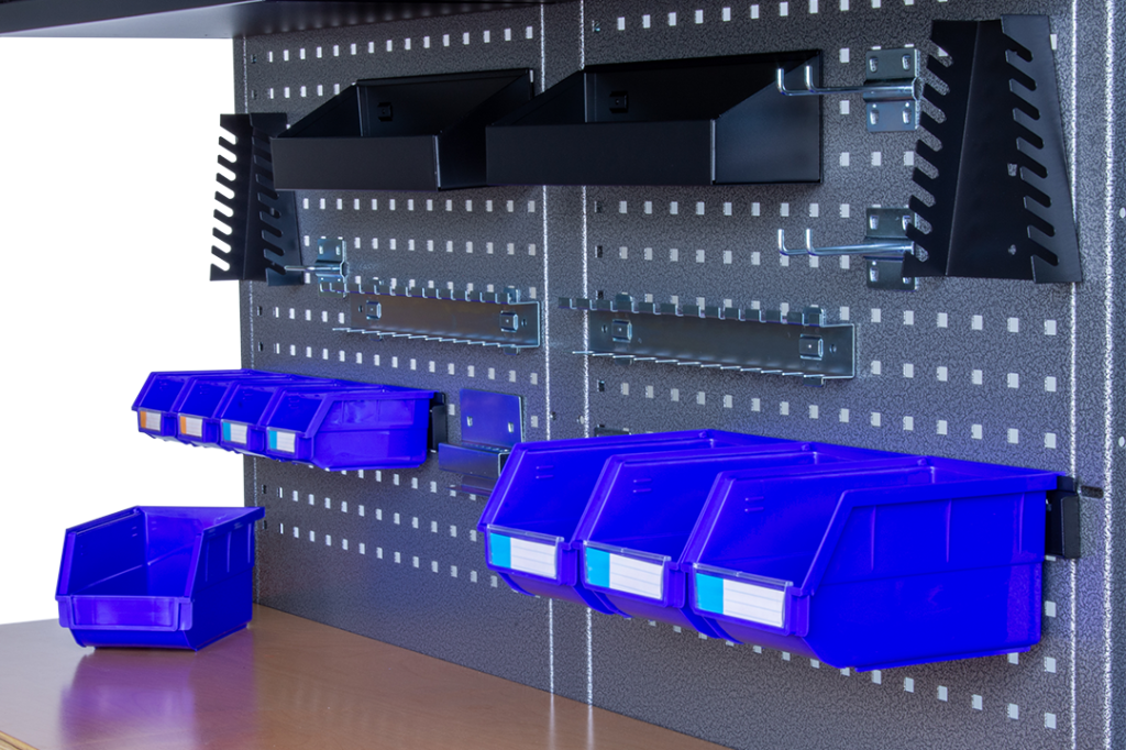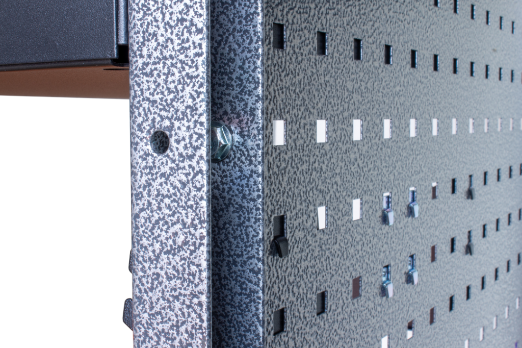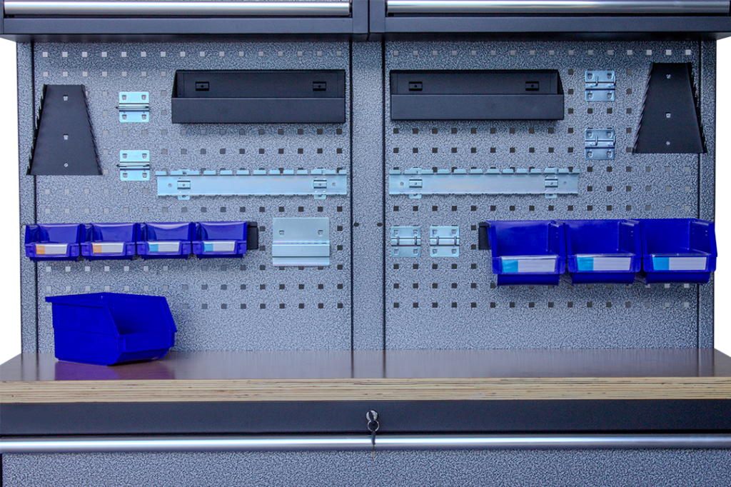 NAD BLATEM ZAMONTOWANO 2 PANELE PERFOROWANE (680 × 600 MM) Z GRUBEJ STALI, ZAMOCOWANE DO PROFILI O GRUBOŚCI 3 MM, KTÓRE STANOWIĄ BAZĘ DO ROZMIESZCZENIA AKCESORIÓW. W ZESTAWIE OTRZYMUJESZ: