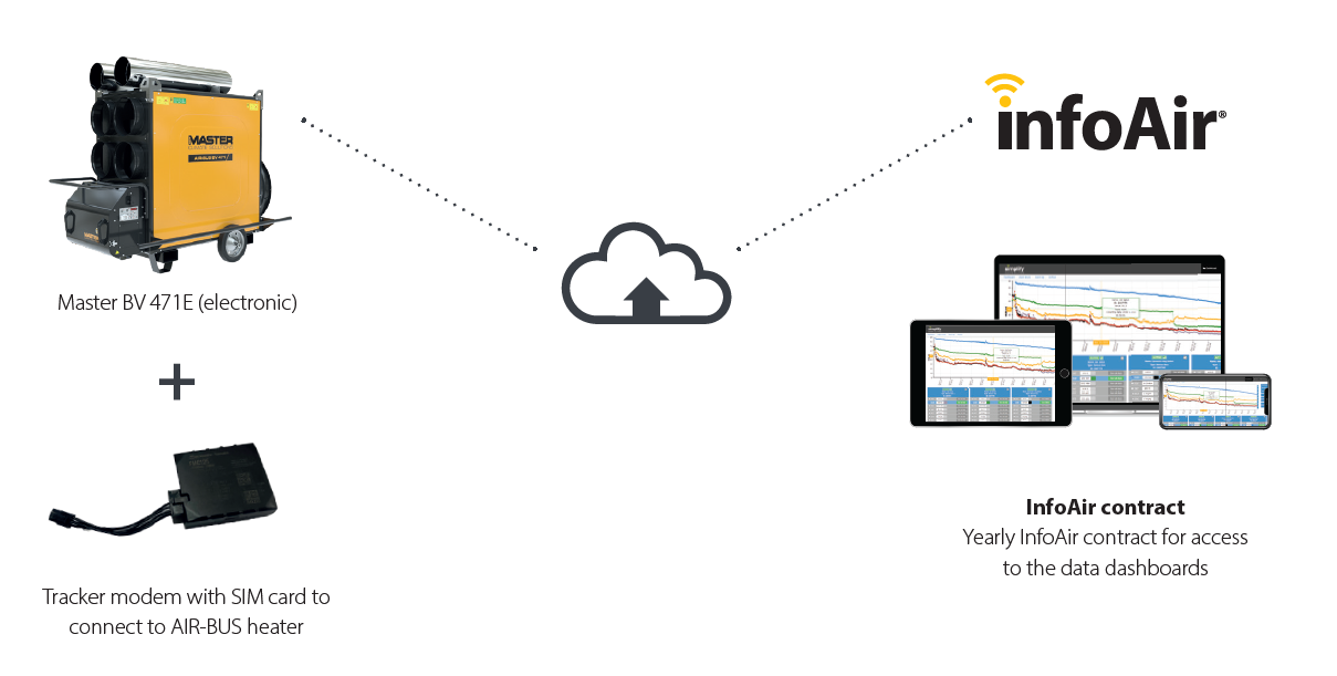 INFOAIR TO WSZECHSTRONNY SYSTEM ZDALNEGO MONITOROWANIA ZAPROJEKTOWANY Z MYŚLĄ O USPRAWNIENIU KORZYSTANIA Z PRZENOŚNYCH NAGRZEWNIC POWIETRZA. BEZ MOŻLIWOŚCI KOMUNIKACJI ZDALNEJ WYMAGAJĄ ONE REGULARNYCH FIZYCZNYCH WIZYT W MIEJSCU PRACY W CELU SPRAWDZENIA ICH DZIAŁANIA. INFOAIR ROZWIĄZUJE TEN PROBLEM I OFERUJE SZEREG KORZYŚCI. UPRASZCZA ZARZĄDZANIE FLOTĄ, DOSTARCZAJĄC W CZASIE RZECZYWISTYM DANE O WYDAJNOŚCI I STANIE OPERACYJNYM Z DOWOLNEGO MIEJSCA. ZDALNE ALERTY W PRZYPADKU PRZESTOJU, NISKIEGO POZIOMU PALIWA, ZBLIŻAJĄCYCH SIĘ WYMAGAŃ SERWISOWYCH/KONSERWACYJNYCH LUB PODOBNYCH MINIMALIZUJĄ PRZERWY W PRACY I ZAPEWNIAJĄ KOMFORT UŻYTKOWANIA.